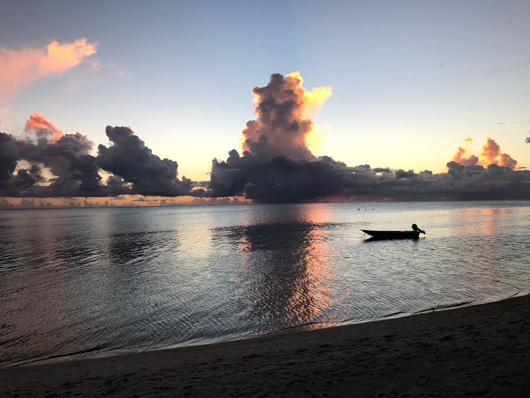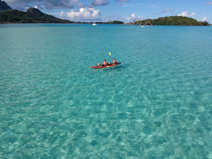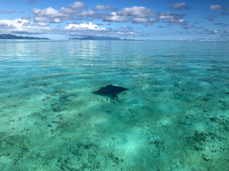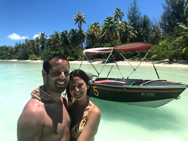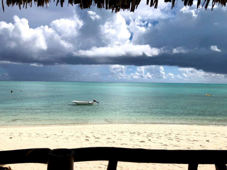 Si bien podías meterte en el agua y caminar bastante hasta un punto que no se oyeran las máquinas y no hubiera algas, mi idea de playa ideal no se cumplió. Juan fue a preguntar si había otra playa en el motu (isla), y le dijeron que no. Días después, al hacer un recorrido en barquito por la laguna de Bora Bora, vimos que sí tenía….