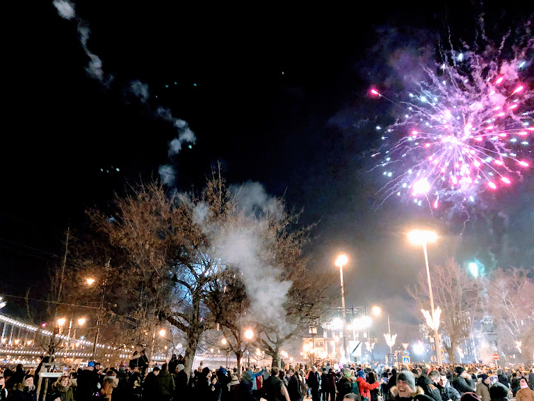 Al acercarse las 12, muchísima gente empieza a acercase al río, donde se lanzan unos fuegos artificiales preciosos. El ambiente es muy divertido, y a nosotros nos pareció seguro, no vimos ningún problema.