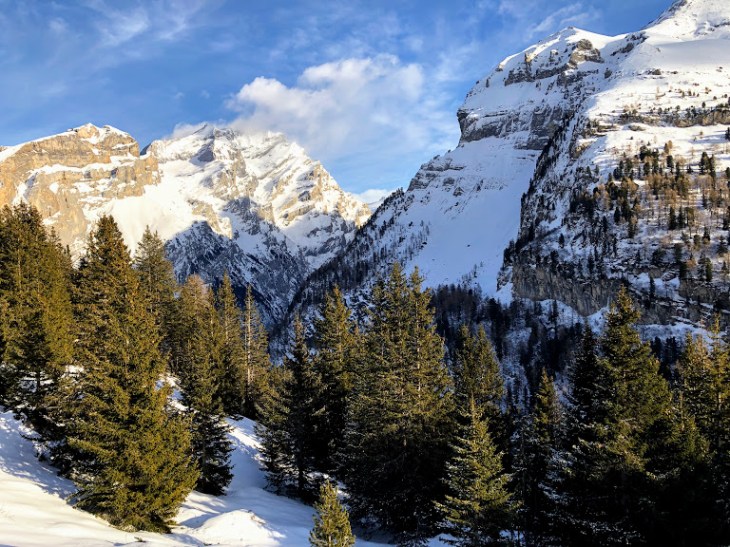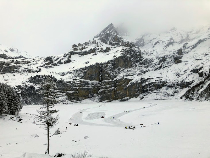 Este lago se encuentra en arriba de Kandersteg. Se llega a través de un teleférico que sale casi del centro del pueblo, por lo que es súper accesible. Una vez que subes en el teleférico, debes caminar una media hora hasta llegar al lago. El camino hacia el lago es precioso, lleno de pinos, con unas vistas a las montañas impresionantes. Aquí también hay pistas de esquí, por lo que aplica el mismo comentario que para Gemmipass: ojo al cruzar las pistas de esquí. También se pueden alquilar trineos, mucha gente lo hace, ya que no se requiere mayor destreza y es muy divertido.
