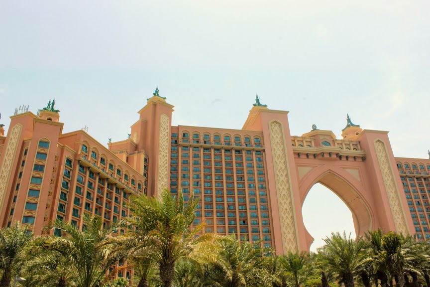 El enorme hotel Atlantis se encuentra en la punta de la isla palmera Jumeirah. El hotel consta de dos torres unidas por un puente y fue inspirado en el hotel Atlantis de Bahamas, que es prácticamente igual. La isla es una isla artificial en forma de palmera, de varios kilómetros, que puede observarse bien cuando está llegando en avión a Dubai. Cuando estás en la isla, ni te das cuenta la forma que tiene. Nosotros vistamos esta zona con el bus turístico.