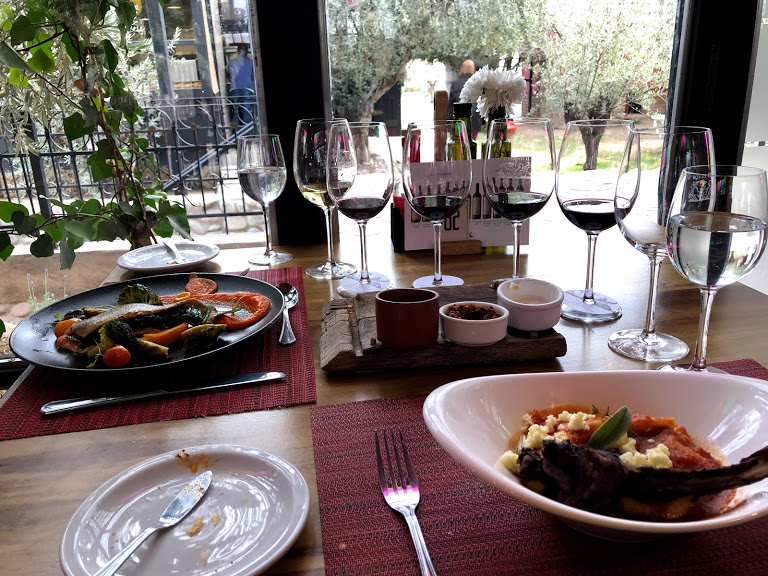 Nuestro almuerzo consistía en entrada, plato principal y postre, con variedad de panes caseros. Nosotros decidimos hacer la degustación de dos vinos cada uno, pero al final terminamos tomando como cinco cada uno! Además de la degustación que contratas, ellos te convidan con algunos otros vinos de ellos, así como vinos de bodegas amigas. Es por eso que terminamos un poquito borrachos! Si no tienen mucho aguante, no contraten una degustación más grande porque no podrán con ella.