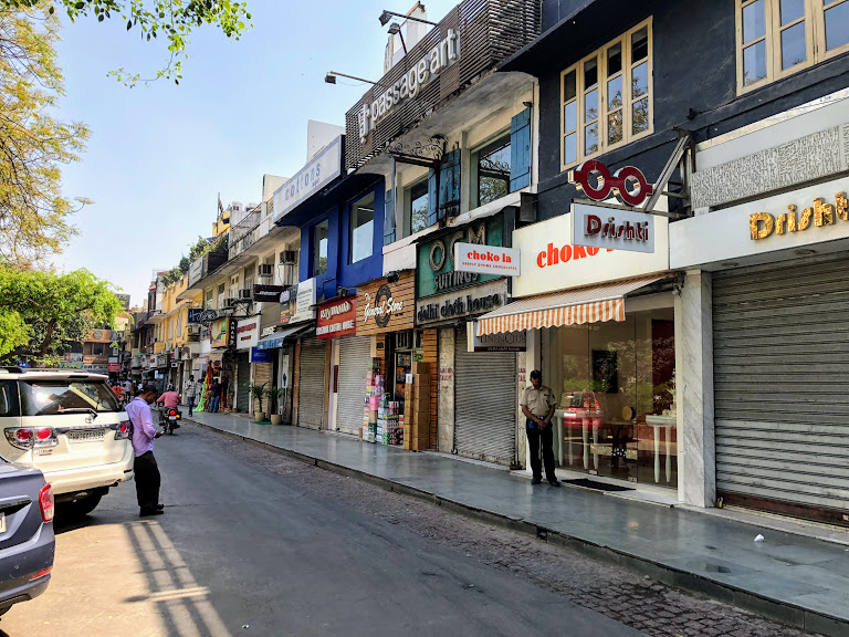 Este pequeño centro comercial tiene varias tiendas exclusivas, joyerías y elegantes restaurantes, lo que lo hacen una de las zonas más caras de la India. No tuvimos en cuenta que era domingo y encontramos la mayoría de las tiendas cerradas.