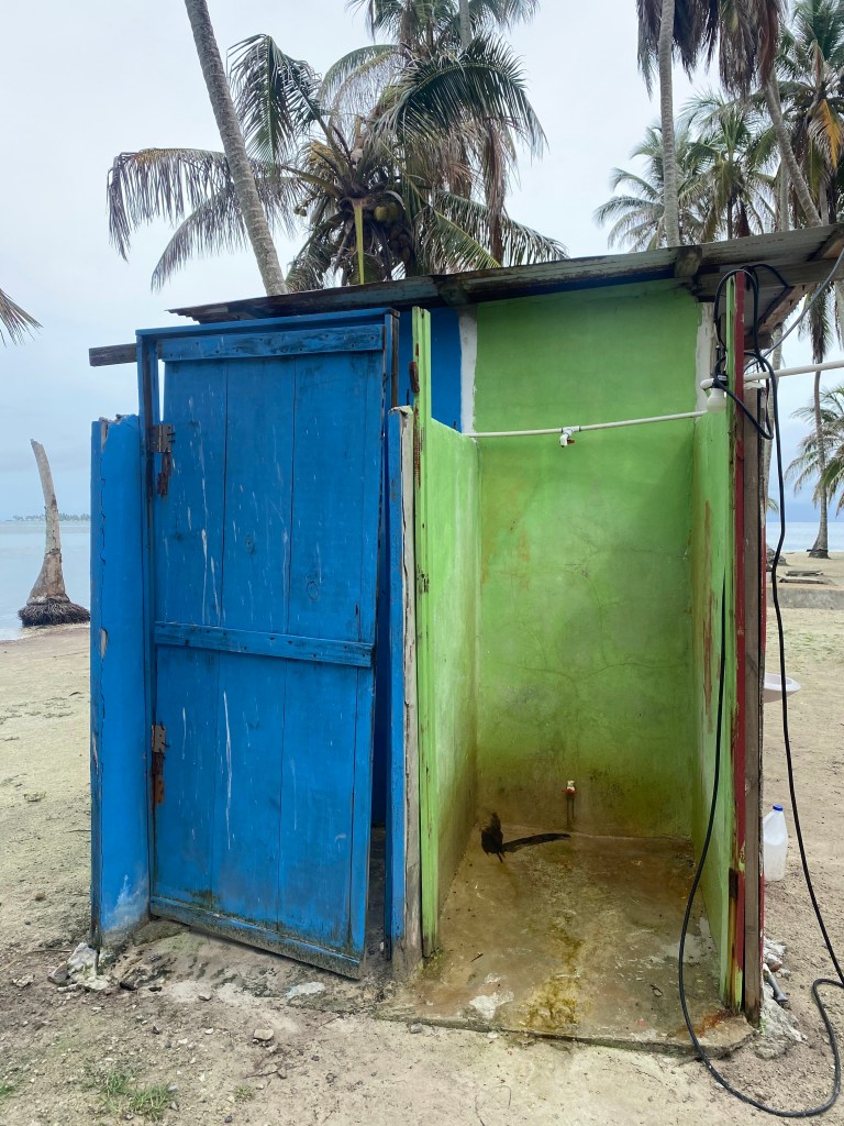Arranco por lo peor: la falta de agua dulce. Todo se hace con agua de mar… la ducha, el agua para lavarse los dientes… y obviamente también la limpieza de la comida. Esto no estaba detallado en el sitio de San Blas Dreams, y creo que fue lo que más sufrimos… pasamos pegoteados 3 días, un asco. Además, había una sola ducha en terribles condiciones para todos los huéspedes, unas 20 personas.
