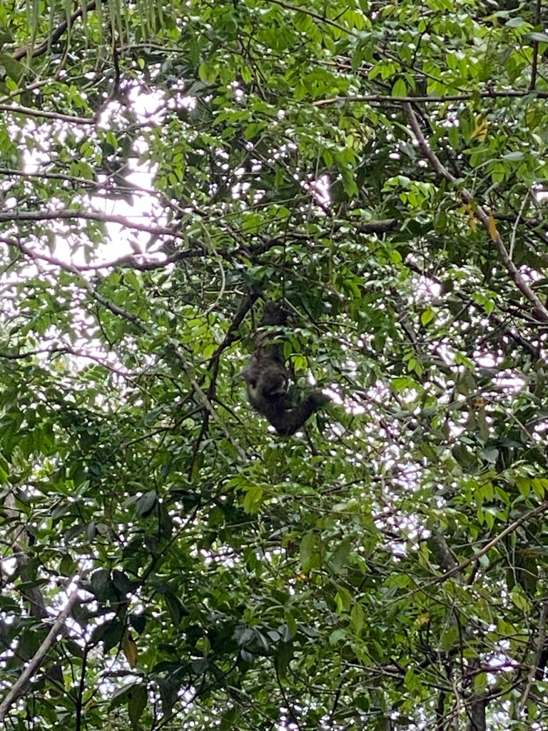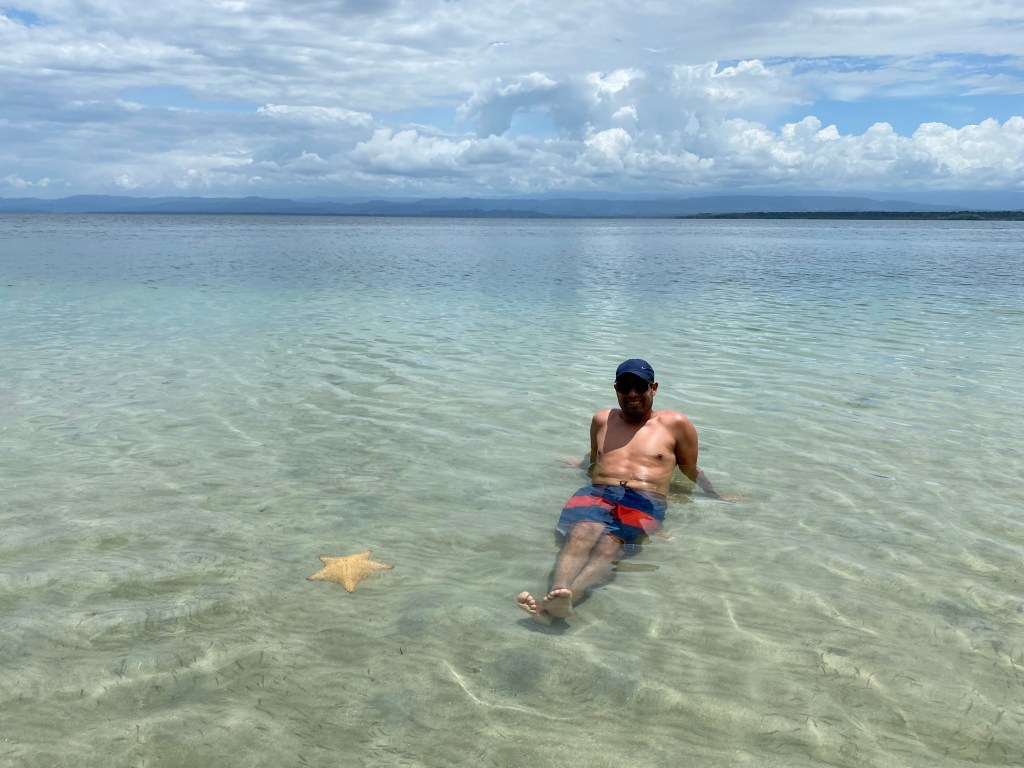 Segundo día: Ida a playa Estrella en isla Colón. Fuimos en bus, que sale a todas las horas en punto desde la plaza principal. El costo es de 2,5 usd el tramo. También se puede ir en lancha, pero sale un poco más caro, o sino en bicicleta, pero el camino está todo en obras, y no está muy lindo. El bus llega a la playa Bocas del Drago, y desde allí hay que caminar unos 15-20 minutos hasta playa Estrella. La playa es llanita, con un montón de estrellas de mar, y sin mucha arena. Hay varios puestos de comida y bebida, música, etc. No es precisamente una playa súper tranquila. Al lado de la playa hay selva, y ahí pudimos ver osos perezosos! Un detalle importante a tener en cuenta sobre esta playa es que las estrellas de mar tiran unas pequeñas espinitas transparentes, las cuales quedan en el agua. Y se te clavan en los pies, la cola (si estás sentado en el agua, etc…) y son súper difíciles de ver, y por ende de sacar… nos fueron pinchando los pies todo el camino hasta la noche que nos las sacamos con pinzas.