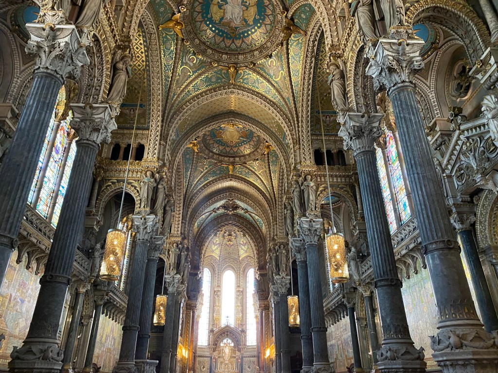 Sobre edificios religiosos, tenemos la Catedral de Lyon, de época medieval, y la Basílica Notre-Dame de Fourvière, mucho más moderna. La basílica en lo alto de la colina, es de los templos más bellos a los que entré. El interior tiene una decoración cargada pero con colores pastel, que es toda una belleza.