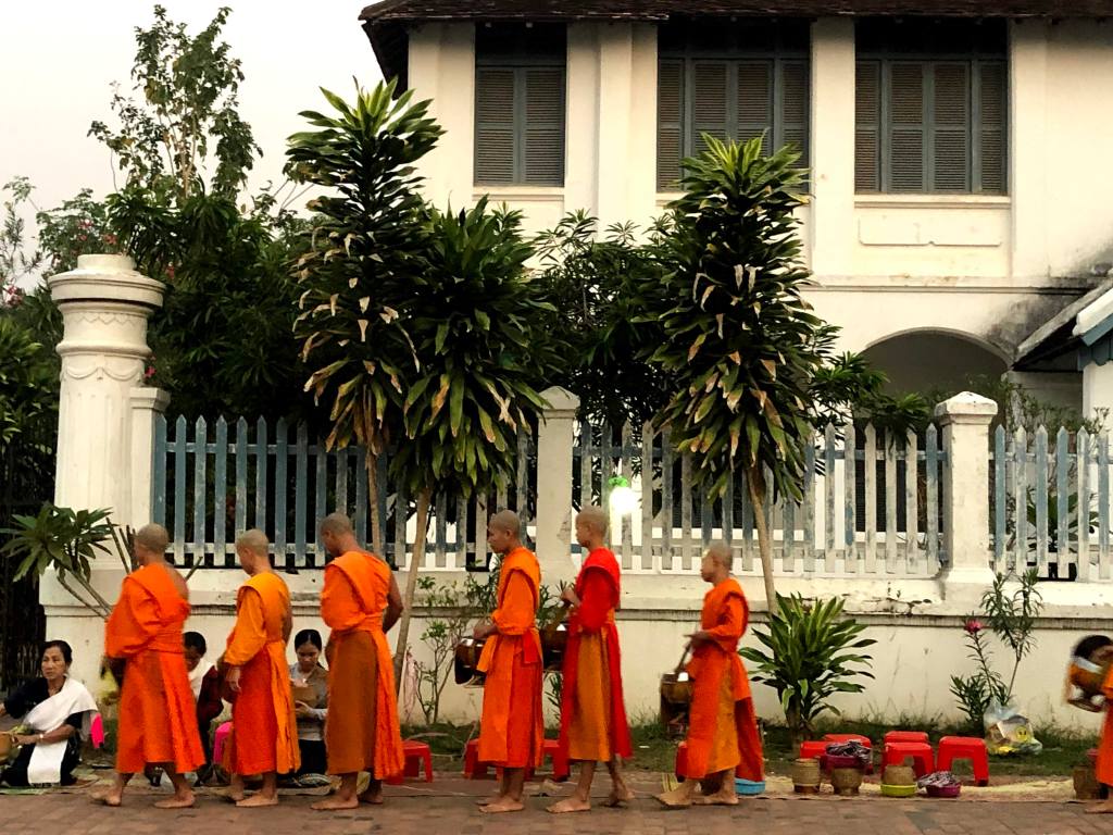 - Ceremonia de limosnas (5 AM). Esto es algo que creo que sucede todos los días, y vale la pena levantarse temprano para verlo. En la calle, la gente está arrodillada y ofrece arroz a los monjes que pasan. Hay que permanecer en silencio y respetar este ritual, sin interrumpir. Si bien hay turistas que también se sientan para ofrecer arroz, a nosotros nos pareció que era más adecuado participar desde fuera.