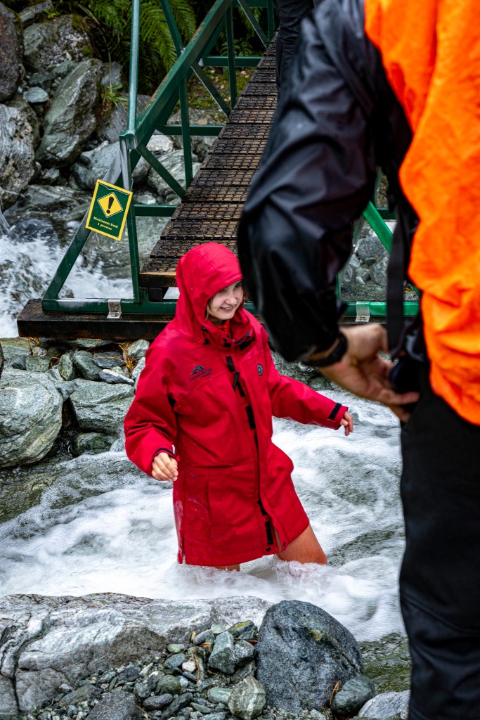 Los lodges de Ultimate Hikes se encuentran también en entornos hermosos y cuentan con muchas más comodidades: zona de estar con sillones, juegos, instrumentos musicales, libros; baños impecables con duchas y agua caliente, y energía hasta las 22 hs. Hay habitaciones compartidas (aunque si van en pareja es muy probable que les toque solos, porque hay más lugares que cupos) y habitaciones privadas (esas salían bastante más caras). Pero además de todo eso, tenía zona para lavar la ropa y botas, y dos grandes habitaciones de secado: una a mayor temperatura para la ropa, y otra a menor temperatura para las botas (para cuidar que no se despeguen por el calor). Realmente creo que todo hace la diferencia a nivel de confort, pero esto de la habitación de secado la sacó del estadio… Fiordland es MUY húmedo y sería imposible secar al aire libre de un día para el otro. El día uno ya me tuve que sumergir en el río helado hasta la mitad de los muslos… imaginate si iba a tener que pasar todos los días siguientes con la ropa y las botas mojadas. Seguro me iban a gustar las vistas del camino, pero también estoy segura que no iba a pasar tan cómoda.